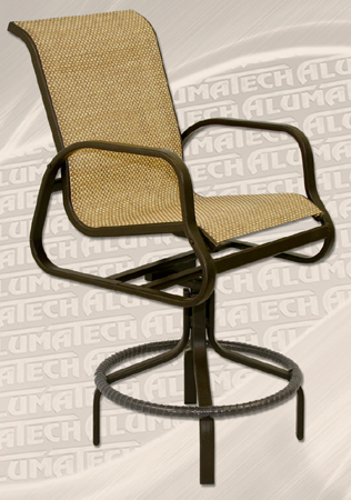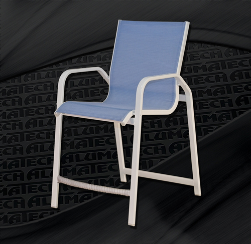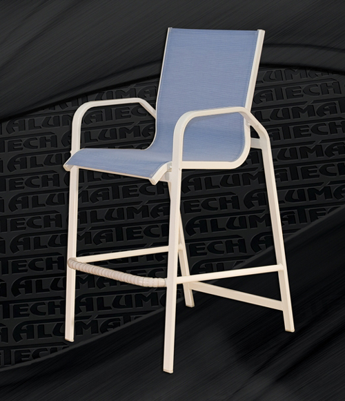 Z-775 Commercial Sling Bar Stool with Arms Tension Spring Technology Through bolt procedure We raised the seat height on this chaise lounge, which makes it easier to get in and get out of. Available in a variety of Slings and finishes Ships fully assembled W = 23 " D = 31" H = 49" SH = 31" AH = 39"