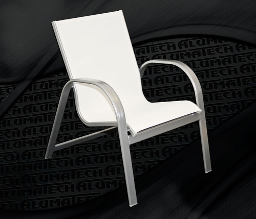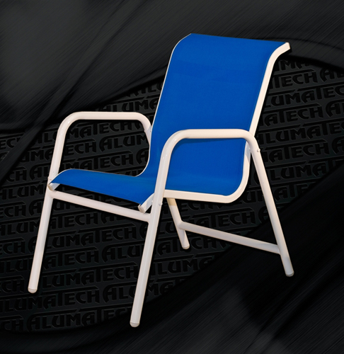L-55- Legend Line Commercial Stacking Sled Lawn chair Base keeps chair legs from sinking into the ground Back legs reinforced with tube inside legs 2-extra seat braces Available in a variety of straps and finishes Ships fully assembled (See our other sled based Lawn Furniture) Specifications: W - 25" D - 29.5" H - 35.5" SH - 16.5" AH - 23